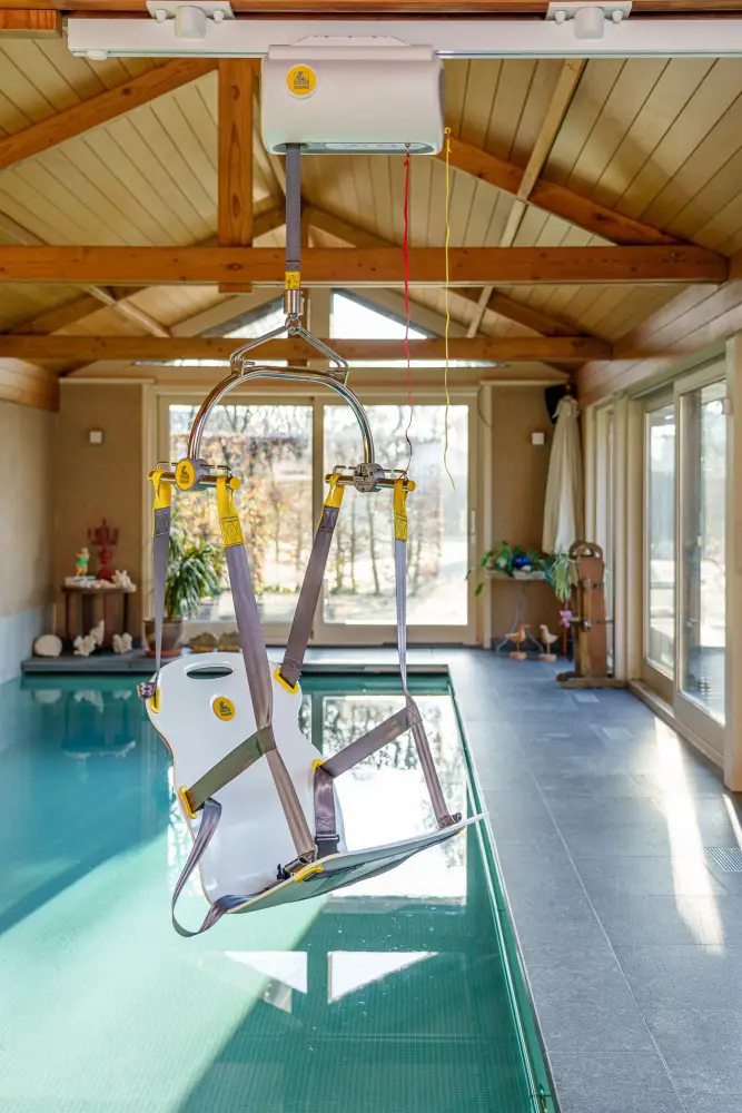 ¿Tiene dificultades para caminar, pero puede sentarse solo en la grúa piscina? Entonces entrar y salir de la piscina será muy sencillo.